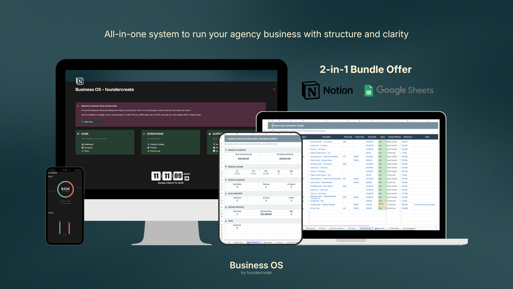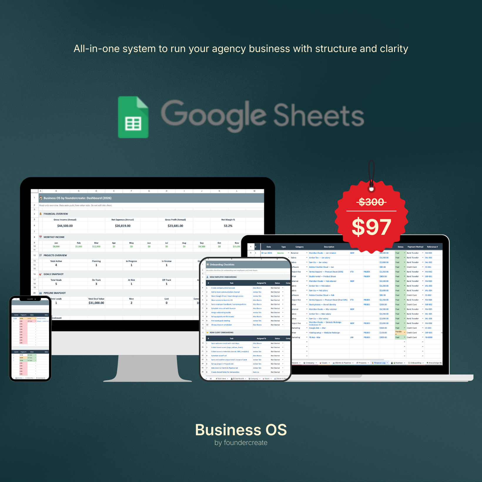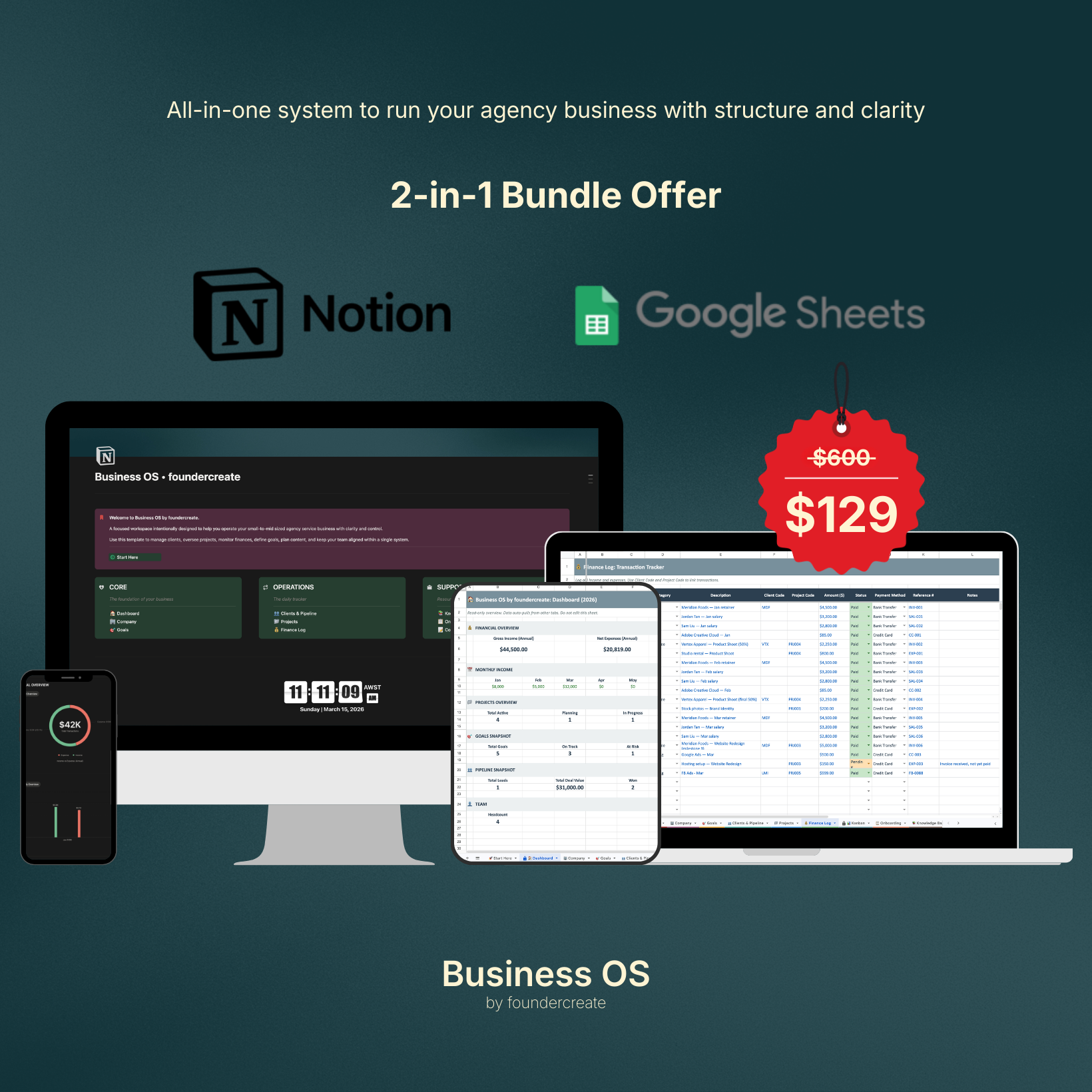 You don't have a productivity problem. You have a systems problem. Client details here, deadlines there, finances in a spreadsheet you haven't opened since last month. Things slip. Invoices get forgotten. Follow-ups don't happen. Fret not, Business OS by foundercreate fixes that.