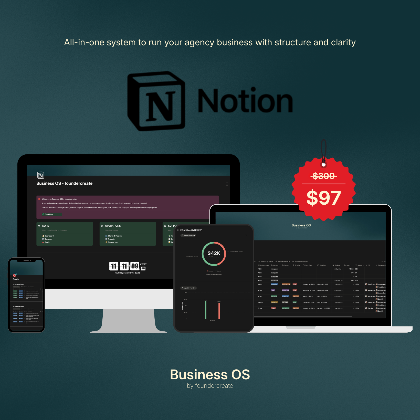 Clients in one tab, projects in another, finances somewhere you stopped checking. Business OS is a fully built Notion workspace that pulls everything into one place, so you can actually see what's going on and get back to doing the work.